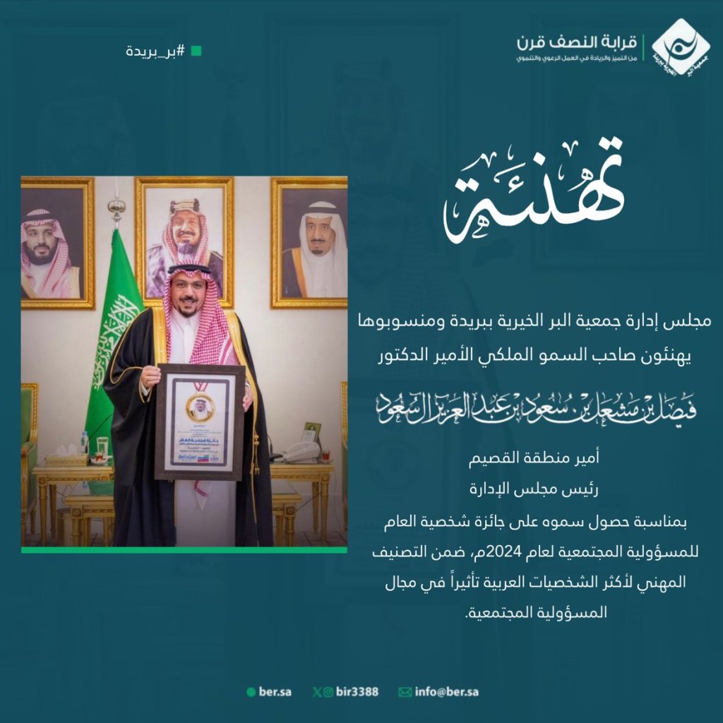 بمناسبة حصول سموه على جائزة شخصية العام للمسؤولية المجتمعية لعام 2024م،